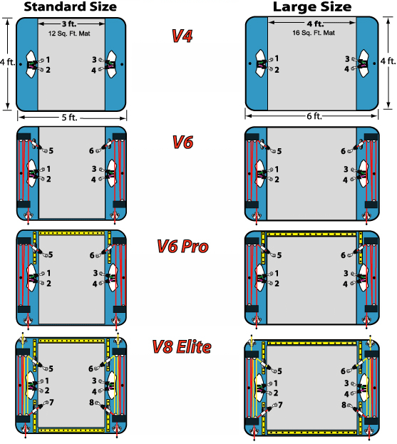 Базовая модель VertiMax V4 имеет 4 троса, создающих сопротивление: 2 с левой стороны платформы и 2- с правой. В зависимости от целей тренировок и показателей спортсменов меняется и количество используемых тросов: можно использовать как 2, так и все 4. Сопротивление каждого может настраиваться в индивидуальном порядке (при этом используются специальные фиксаторы на платформе).