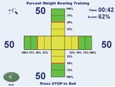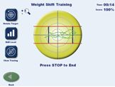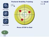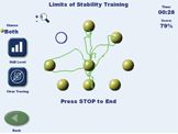 | Упражнение на перемещение веса. Упражнение заключается в перемещении центр тяжести в заданном 2-мя параллельными линиями коридоре в следующих направлениях: медиально-латеральном, передне-заднем и боковом. Счет на экране используется для оценки прогресса выполнения. |